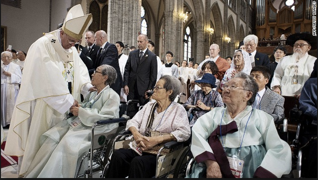 [Pope] Francis greeted each of the seven women, most in wheelchairs, at the front of Seoul¡¯s main cathedral Monday at the start of his final Mass for peace and reconciliation on the Korean peninsula.